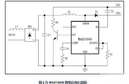 而MAX16840芯片有3個重要引腳功能:FB引腳電壓可檢測輸入電流,并調節其平均值;而輸入引腳(REFI)用于設置輸入電流值,引腳電壓低于特定門限時,輸入電流與該電壓成正比,電壓超過特定門限時,輸入電流將置于固定的預置水平。據此利用REFI的非線性特性,連接一個NTC電阻,即可得到熱折返保護;IN引腳具有內部過壓保護,避免內部開關MOSFET在LED串開路或LED串電壓過高時損壞;它帶有一個獨立的EXT引腳,確保低輸入電壓開啟時提供一個觸發啟動電流,以配合電子變壓器正常工作。EXT驅動外部npn晶體管,一旦IN跌落到5.5V UVLO門限以下,將EXT拉至地電平,外部npn晶體管關斷。其IC采用3mm x 3mm、10引腳、TDFN封裝,-40°C至+125°C工作溫度范圍。圖4為MAX16840典型應用示意圖。它被廣泛應用于MR16及其它12V交流或直流輸入LED照明之中。