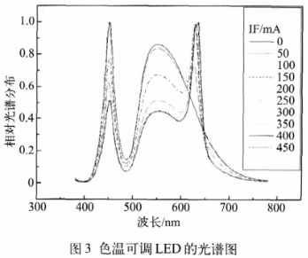 圖3為采用遠方HASS-2000高精度快速光譜輻射計測量得到的色溫可調LED 的光譜圖,從圖中可以看出,隨著紅光LED 電流的變化(從0 到450mA),LED 的相對光譜也會隨之變化,LED 的光譜有三個峰值,分別在450nm、550nm和628nm,暖色溫的發(fā)光效率大于68lm/W,冷色溫的發(fā)光效率達到87lm/W。