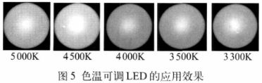 集成封裝的LED,由于工作電流較大,工作時產生大量的熱量,積聚在pn 結內部的熱如不及時傳導出去,將導致器件溫度升高,溫度對LED的性能產生重要的影響,如色溫變化、波長紅移、正向壓降等。圖5 所示為色溫可調LED的應用效果,將封裝好的色溫可調LED模塊安裝到100mm筒燈上,紅光LED加上不同的電流,得到筒燈的發(fā)光效果。筒燈連續(xù)點亮30min 后,測試筒燈上散熱器溫度為38℃,鋁基覆銅板上的溫度為38.5℃(室溫25.2℃),說明色溫可調LED 具有良好的散熱性能。