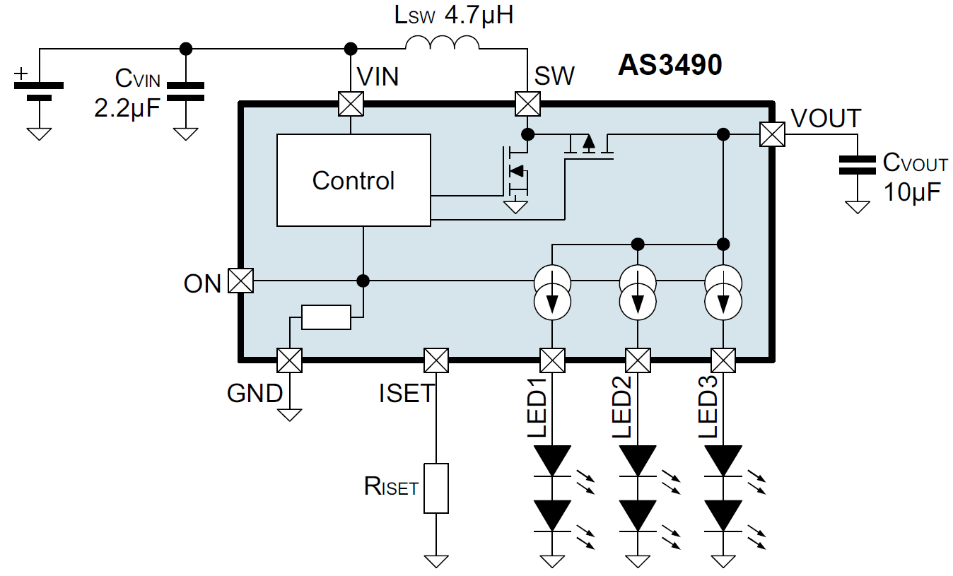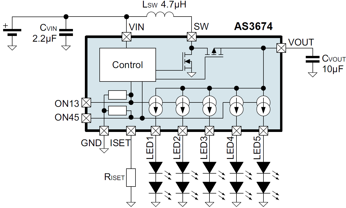 軟啟動(dòng)的特點(diǎn)使AS3674更容易集成到對(duì)噪音敏感的無線射頻系統(tǒng)中。AS3674由兩組輸入電路控制,也可用介于100-800赫茲的PWM電路控制,實(shí)現(xiàn)1:2000的調(diào)光比。單通道兩個(gè)LED的配置結(jié)合2 MHz的轉(zhuǎn)換器操作頻率,實(shí)現(xiàn)使用諸如4.7µH電感的微小外部組件并取得優(yōu)于競(jìng)爭(zhēng)對(duì)手最高達(dá)6%的高效率。