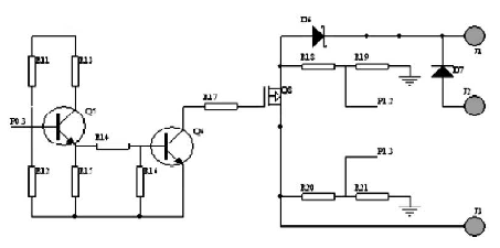為了在夜間不同時(shí)刻采用不同的亮度,以達(dá)到節(jié)約電能的目的,本系統(tǒng)設(shè)計(jì)了兩路負(fù)載輸出,晚上12點(diǎn)以前兩盞LED皆亮,12點(diǎn)后一盞點(diǎn)亮,每路輸出均有立的控制和檢測(cè)。設(shè)計(jì)采用了PWM功率控制功能對(duì)LED燈具實(shí)現(xiàn)無(wú)級(jí)調(diào)光。單路原理如圖3所示。其中單片機(jī)P0.6 口給出控制信號(hào), 即P 0 . 6 = 1 時(shí), 三極管導(dǎo)通,繼電器閉合,MOS管導(dǎo)通,蓄電池向路燈供電。在電量不足或白天時(shí),控制端輸出低電平信號(hào),切斷供電回路。夜晚蓄電池電量不足情況下由市電供電系統(tǒng)給LED路燈供電,保證系統(tǒng)的完整和可靠。