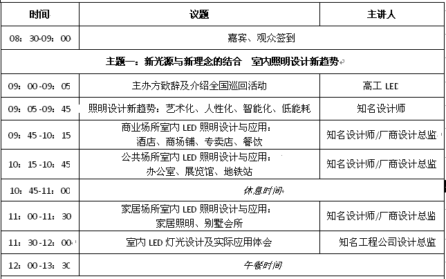 整個(gè)巡回研討會暨大賽將持續(xù)5個(gè)月時(shí)間,3月份為活動啟動宣傳階段,4-5月份為全國巡回研討及大賽報(bào)名階段,6‐8 月份為大賽作品提交及評審階段。巡回總結(jié)大會暨設(shè)計(jì)大賽頒獎(jiǎng)典禮將于2012 高工LED 展期間(8 月17 日)在廣州保利世貿(mào)館召開。