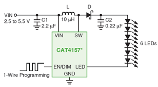 在電感升壓型拓?fù)浣Y(jié)構(gòu)方面,安森美半導(dǎo)體提供采用PWM和/或單線式調(diào)光方式的不同產(chǎn)品,適合在低電壓便攜式設(shè)備背光和閃光應(yīng)用中驅(qū)動(dòng)白光LED。這些產(chǎn)品包括:輸出電流為20 mA的CAT37、CAT32、CAT4238、CAT4252、CAT4253、CAT4157、CAT4158和CAT4258,輸出電流為40 mA的CAT4137和NCP5005,輸出電流為50 mA的CAT4139,以及更大輸出電流的CAT4240(250 mA)、NCP1422(800 mA)和CAT4131(1.5 A/0.3 A)等。