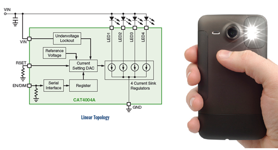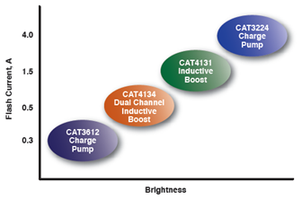 LED越來越多地應(yīng)用于拍照手機(jī)、智能手機(jī)和氙氣燈泡替代,且光輸出能力不斷提供,從而滿足更高的性能需求。安森美半導(dǎo)體的CAT3612、CAT4131、CAT4134和CAT3224都是這類驅(qū)動(dòng)方案。這些器件分別采用電荷泵、電感升壓拓?fù)浣Y(jié)構(gòu),可以提供不同的閃光電流和亮度。