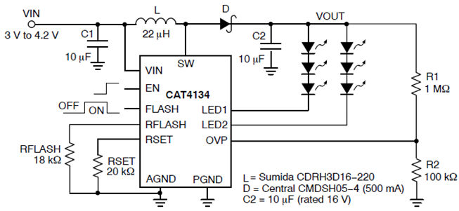 以CAT4134為例,這是一款大功率電感升壓型雙通道驅(qū)動(dòng)轉(zhuǎn)換器,提供2路匹配的LED電流。輸出電流級(jí)別通過2個(gè)電阻之一RSET或RFLASH來控制。當(dāng)FLASH輸入引腳為低(電影模式),電阻RFLASH設(shè)置LED電流。每個(gè)通道驅(qū)動(dòng)2或3個(gè)白色串聯(lián)LED,并提供1個(gè)可調(diào)節(jié)電流以控制其亮度。支持輸入電壓低至3V,使得器件適合于鋰離子電池的應(yīng)用。