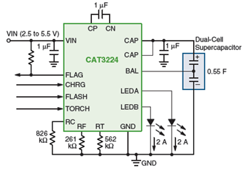 電荷泵型驅(qū)動(dòng)器CAT3224也適合相機(jī)閃光應(yīng)用,從而支持高百萬像素相機(jī)閃光,以及替代氙氣閃光,配合纖薄設(shè)計(jì)。CAT3224是業(yè)界首款4 A單芯片超級(jí)電容LED驅(qū)動(dòng)器,集成了雙模1x/2x電荷泵,提供三項(xiàng)關(guān)鍵功能:精密的超級(jí)電容充電控制、電流放電至LED閃光的管理,以及為L(zhǎng)ED手電筒模式提供恒流。這三種模式的工作電流均可以3個(gè)外部電阻來簡(jiǎn)易編程,提供達(dá)4 A的LED閃光脈沖電流。超級(jí)電容技術(shù)的高峰值電流優(yōu)勢(shì),結(jié)合CAT3224簡(jiǎn)單的并行邏輯接口,使該器件非常適用于采用LED替代氙氣燈的應(yīng)用。