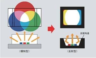 帶反射罩,無橫向漏光,顯著改善正面光強度。小型封裝,元件間距離短、混色性能優異的產品。