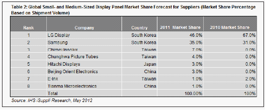 據(jù)IHS iSuppli公司的中小顯示器市場追蹤報告,LG顯示器和三星顯示器去年是火爆的平板產(chǎn)品市場的最大顯示器面板供應(yīng)商,合計占有超過80%的出貨量份額。