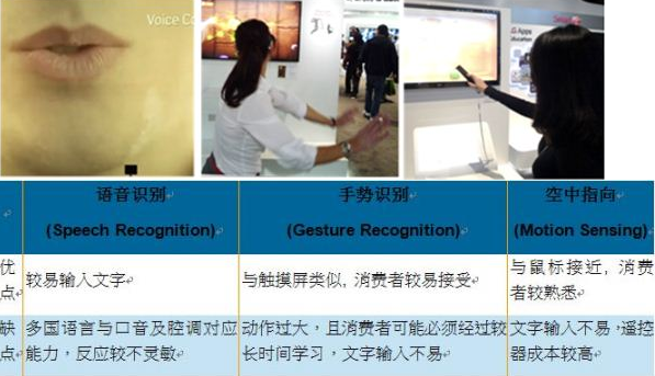 目前在許多電視機廠商與電視品牌的努力之下,已經(jīng)出現(xiàn)了三個通用的人機界面解決方案:語音識別 (Speech Recognition),手勢識別 (Gesture Recognition)和動作感應(yīng) (Motion Sensing)。每種方式均有其優(yōu)點和缺點,簡單分列如下。