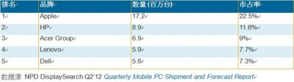 根據(jù)NPD DisplaySearch最新的季度Mobile PC出貨數(shù)量與預(yù)測報(bào)告初步調(diào)查結(jié)果,蘋果公司在2012年第一季出貨將近1,720萬臺(tái)Mobile PC,年成長率為118%。而約有80%的蘋果出貨來自iPad,第一季出貨量為1,360萬臺(tái),年成長率達(dá)162%。