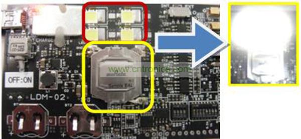 圖2中EDLC作為輔助電源,顯示了8A的電流流入LED時的數據。得出的結果是超過了1,000lux的亮度。