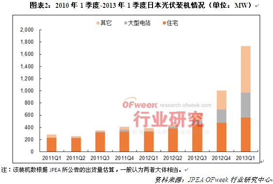 導讀: 根據日本經濟貿易產業省公布數據顯示,2012年日本光伏新增裝機2.5GW,其中住宅項目為1.6GW,占比65%;2013年第一季度,日本新增裝機1.7GW。