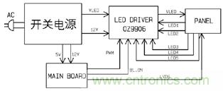 電視顯示系統(tǒng)包括電源板、主板、背光驅(qū)動板等, 電源板提供VLED、12V給背光板,主板提供背光控制信號BL_ON和調(diào)光PWM信號給背光板。背光驅(qū)動ICOZ9906 檢測PANEL內(nèi)部五條燈條的流過的電流,進(jìn)行定電流和電流平衡控制,點(diǎn)亮背光系統(tǒng)。