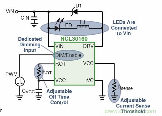大功率LED可采用安森美半導(dǎo)體的恒流降壓LED驅(qū)動器NCL30160,實(shí)現(xiàn)高達(dá)98%的能效。它采用30 mΩ集成MOSFET,100%占空比可提供高能效;輸入電壓范圍為6.3 V至40 V,開關(guān)頻率可達(dá)1.4 MHz;還具有專用PWM調(diào)光引腳/低功率關(guān)閉、無須控制環(huán)路補(bǔ)償和1.5 A平均電流能力。