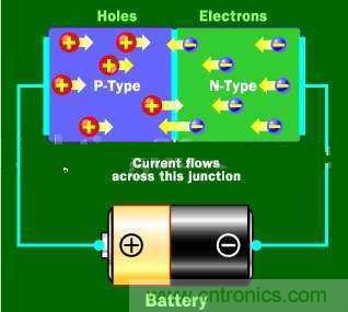 為了除掉損耗區(qū)就必須使N型向P型移動和空穴應(yīng)反向移動。為了達到目的,連接二極管N型一方到電流的負極和P型就連接到電流的正極。這時在N型物質(zhì)的自由電子會被負極電子排斥和吸引到正極電子。在P型物質(zhì)中的電子空穴就移向另一方向。當電壓在電子之間足夠高的時候,在損耗區(qū)的電子將會在它的電子空穴中和再次開始自由移動。損耗區(qū)消失,電流流通過二極管。