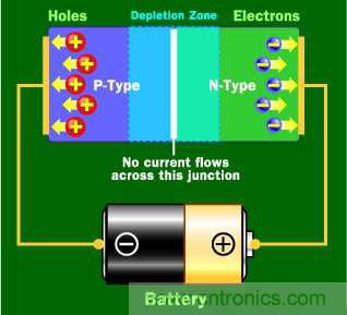 如果嘗試使電流向其它方向流動,P型端就邊接到電流負極和N型連接到正極,這時電流將不會流動。N型物質(zhì)的負極電子被吸引到正極電子。P型物質(zhì)的正極電子空穴被吸引到負極電子。因為電子空穴和電子都向錯誤的方向移動所以就沒有電流流通過匯合處,損耗區(qū)增加。
