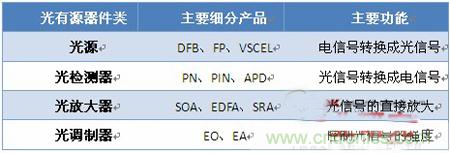 光通信器件包括光有源器件和光無源器件,有源無源按照是否需加外界能源驅動來區分。光有源器件主要負責光信號的產生、放大和接收,完成信號的光-電-光轉換和放大等功能。光有源器件包括光纖放大器、光纖激光器、光收發器和光調制器,這些器件都是光發射機、光接收機和光中繼器的關鍵器件,和光纖一起決定著基本光纖傳輸系統的水平。