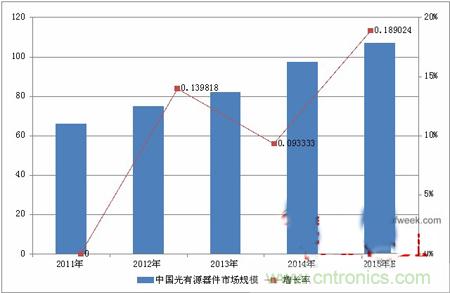 據OFweek行業研究中心出版的《2015-2018年中國光有源器件市場分析及前景預測報告》顯示,2011年-2014年中國光有源器件市場規模增長較快,年復合增長率達到14%。未來幾年會有所放緩,年復合增長率會降至10%左右。2014年中國光有源器件市場規模為97.5億元人民幣,估計2015年將達到107億元。