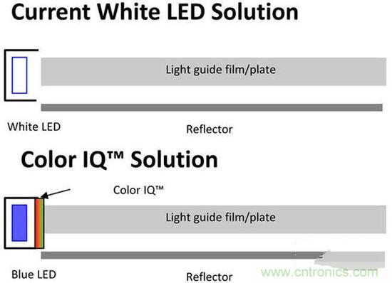 (這是顯示屏背光的橫截面圖,上方是傳統W-LED背光方案,下圖為量子點背光方案,長條可以理解為燈管,左側即是光源。在量子點背光方案中,除了左側的藍色LED燈外,右邊部分加上了紅色與綠色量子點)