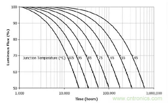 如果環(huán)境溫度是105℃,那么還至少要加上20℃才是結溫,所以結溫就大約是125℃。在這個曲線上已經(jīng)查不到了,只能大致地估算其壽命只有4,000小時。這是絕對不能接受的!也就是說,LED泡殼里的環(huán)境溫度必須大大低于105℃!
