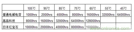 3、各種壽命的電解電容在45℃的環(huán)境溫度下的實際壽命