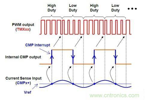 對(duì)于開(kāi)關(guān)電源,PWM占空比決定輸出電壓,如圖3,電路開(kāi)始工作后,LED電流經(jīng)采樣后加到MCU內(nèi)置比較器端口,和參考值進(jìn)行比較,產(chǎn)生中斷信號(hào),來(lái)調(diào)整PWM的占空比,其變化過(guò)程見(jiàn)圖4,如當(dāng)電流大于參考值時(shí),降低占空比;反之,提高占空比,最終達(dá)到一個(gè)負(fù)載電流動(dòng)態(tài)穩(wěn)定的狀態(tài)。