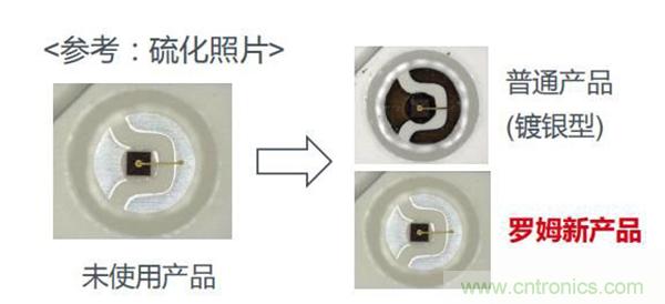 通過對比得出ROHM新產品的優勢:一是能保持亮度,二保護芯片鍵合材料不受損壞,三無需其他保護對策。