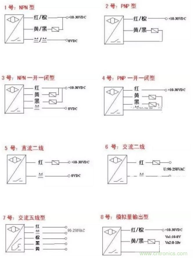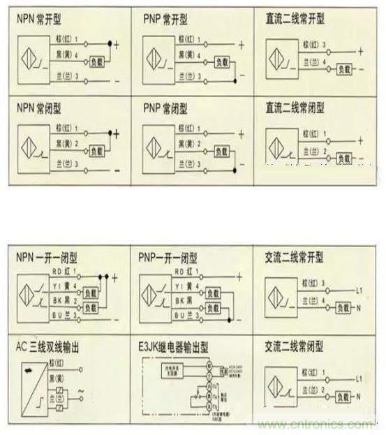 1)接近開關有兩線制和三線制之區別, 三線制接近開關又分為 NPN 型和 PNP 型,它們的接線是不同的。請見下圖所示: