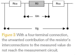 在低阻值電阻中,端子的阻值和溫度系數(shù)的影響往往是不能忽略的,實際設(shè)計中應(yīng)充分考慮這些因素,可以使用附加的取樣端子直接測量金屬材料兩端的電壓。如圖3所示,一個四端子的連接將允許測量系統(tǒng)實際用到的阻值為R0,而普通的連接的阻值為R0+2xRCu 。例如,10 mm長0.3 mm線徑的銅線會增加2.4 mΩ的RCu阻值,4mm長0.2mm寬 35 μm厚度的PCB引線的RCu阻值是10 mΩ