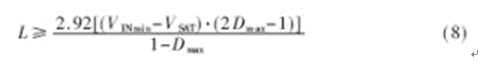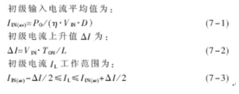 設PWM控制最大占空比Dmax=42%,如果初級繞組的電感量設計得大,則流過功率開關管和輸出濾波電容的電流峰值小,但由于電流上升斜率小,電路抗干擾能力差且功率開關管開通電流大;電感量小時,電流脈動大,沖擊電流大。因此設計電感電流工作在連續工作狀態,輕負載時取額定功率的一半,由(2)式可知: