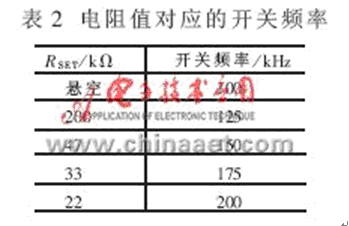 開關頻率可以通過外接電阻RSET在100kHz~200kHz之間調整,這個特點可以讓使用者根據工作頻率優化磁存儲器以及電容器的尺寸、型號等。表2為不同的電阻值對應的常用開關頻率。
