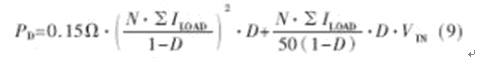 損耗功率PD主要取決于VI、多路輸出最大負載電流之和ΣILOAD以及主功率線圈比N等,其近似計算公式如下: