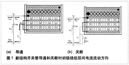對于常規(guī)的4層初級繞組結(jié)構(gòu),在開關管導通和關斷的過程中,層間的電流向同一個方向流動。在圖1中,在開關管導通時,源極接到初級的地,B點電壓為0,A點電壓為Vin,基于電壓的變化方向,初級繞組層間電容中電流流動方向向下,累積形成的差模電流值大。在功率器件關斷瞬間,MOSFET漏-源極電容充電,變壓器初級繞組的層間電容放電,這兩部分電流也會形成差模電流。同樣,基于電壓的變化方向,初級繞組層間電容中的電流流動方向向上,累積形成的差模電流值大。