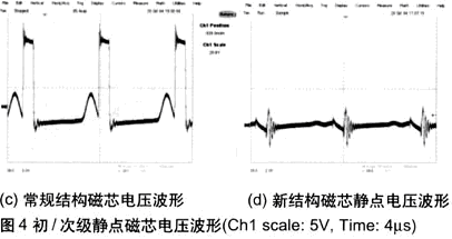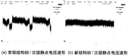 測量變壓器初級和次級靜點的電壓波形及變壓器磁芯的電壓波形,可以為EMI的傳導測試提供一些參考(見圖4)。常規(guī)結(jié)構(gòu)變壓器的初級和次級靜點電壓波形的幅值為10V,并且可以明顯地看到基于開關頻率的開關波形。新結(jié)構(gòu)變壓器的初級和次級靜點電壓波形的幅值為5V,基于開關頻率的開關波形不是很明顯。常規(guī)結(jié)構(gòu)的變壓器的磁芯電壓波形的幅值為18V,可以明顯地看到基于開關頻率的開關波形。新結(jié)構(gòu)的變壓器的磁芯電壓波形的幅值為5V,基于開關頻率的開關波形不是很明顯。