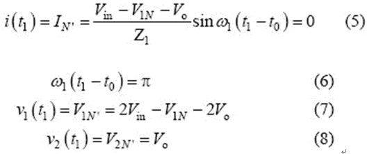 當(dāng)串聯(lián)諧振電流為0(即t1 時刻)時,該模式結(jié)束,可得到如下表達(dá)式: