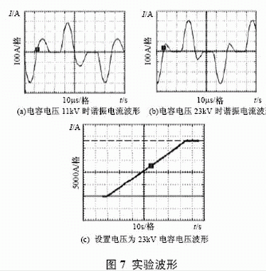 根據(jù)上面所設(shè)計(jì)的諧振參數(shù)進(jìn)行了實(shí)驗(yàn),實(shí)驗(yàn)波形如圖7 所示。可以看出,為保持充電電流恒定,隨著輸出電壓的升高,開關(guān)頻率變高,實(shí)測充電電壓為23kV 時變換器效率為92.7%。實(shí)驗(yàn)表明,所設(shè)計(jì)的諧振參數(shù)完全滿足設(shè)計(jì)要求,該裝置已用于神光III 能源系統(tǒng)。