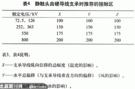 單柱垂直斷口隔離開關(guān),因其靜觸頭懸掛在母線上,為了適應(yīng)風力、溫度和冰雪的影響,確保隔離開關(guān)能可靠合閘,GB1985對接觸區(qū)(也稱鉗夾范圍)提出了推薦值,如表3、表4。在進行變電站設(shè)計和選用隔離開關(guān)時,應(yīng)考慮到具體運行條件,確保靜觸頭處在規(guī)定的接觸區(qū)限值之內(nèi),使隔離開關(guān)能正確地分合閘。