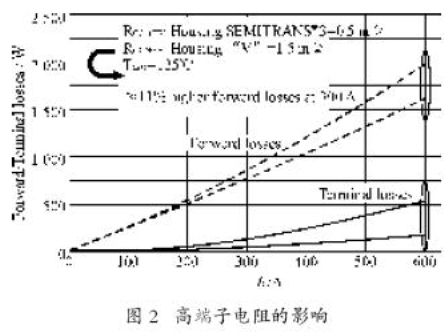 模塊的端子電阻對(duì)電路的工作效率的影響如圖2所示。在圖2所示的例子中,舉例的開關(guān)導(dǎo)通損耗比SEMITRANS高11%。這相當(dāng)于一個(gè)每相絕對(duì)值約90 W,三相共270 W的功率變頻器。