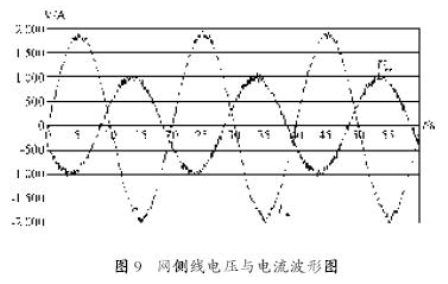 圖9 為發(fā)電機(jī)處于超同步運(yùn)行(轉(zhuǎn)子轉(zhuǎn)速為1 513 r/min),給定轉(zhuǎn)矩為額定轉(zhuǎn)矩的85%,無(wú)功功率給定為零時(shí),電網(wǎng)線電壓、相電流的波形圖。理論分析可知,當(dāng)發(fā)電機(jī)處于超同步運(yùn)行狀態(tài),發(fā)電機(jī)的定子側(cè)和轉(zhuǎn)子側(cè)應(yīng)同時(shí)向電網(wǎng)輸出電能,網(wǎng)側(cè)相電流為定子與轉(zhuǎn)子的電流之和。通常網(wǎng)側(cè)變流器的無(wú)功功率給定設(shè)置為零,所以定子與轉(zhuǎn)子電流的相位相同,都與電網(wǎng)電壓反相。實(shí)際上,由圖可知,電網(wǎng)相電壓與定子電流相位相差180°,完全反相,發(fā)電機(jī)處于發(fā)電狀態(tài),向電網(wǎng)輸出電能,功率因數(shù)為-1。