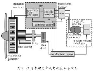 目前流行的變速變槳風(fēng)力發(fā)電機(jī)組的動(dòng)力驅(qū)動(dòng)系統(tǒng)主要兩種方案:一種是升速齒輪箱+繞線式異步電動(dòng)機(jī)+雙饋電力電子變換器;另一種是無(wú)齒輪箱的直接驅(qū)動(dòng)低速永磁發(fā)電機(jī)+全功率變頻器。兩種方案各有優(yōu)缺點(diǎn):前者采用高速電機(jī),體積小重量輕,雙饋?zhàn)兞髌鞯娜萘績(jī)H與電機(jī)的轉(zhuǎn)差容量相關(guān),效率高、價(jià)格低廉,缺點(diǎn)是升速齒輪箱價(jià)格貴,噪音大、易疲勞損壞;后者無(wú)齒輪箱,可靠性高,但采用低速永磁電機(jī),體積大,造價(jià)高,變頻器需要全功率,成本提高。