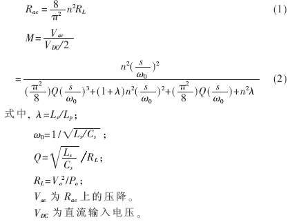 串聯(lián)電感Ls、并聯(lián)電感Lp和諧振電容Cs組成LLC諧振網絡,在此必須注意到負載也參與了諧振。對其進行建模,LLC簡化模型如圖2(b)所示,Ra c為副邊的負載折算到原邊的等效負載,折算公式見式(1)。因為原邊輸入電壓為方波,電流為近似正弦波,而變壓器輸出電壓也是方波,電流也是正弦波,因此可以推導出其電壓傳遞函數,如式(2)所示。