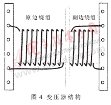 通過上面的分析知道,LLC諧振網絡需要兩個磁性元件Ls和Lp。然而,在實際應用中,考慮到高頻變壓器實際結構,可以把磁性元件Ls和Lp集成在一個變壓器內,利用變壓器的漏感作為Ls,利用變壓器的磁化電感作為Lp。這樣一來,可以大大減少磁性元件數目。在設計時,只要重點設計變壓器的漏感與變壓器磁化電感即可。因此,為增加漏感,需要在變壓器中加入適當的氣隙,并且控制變壓器原副邊的繞線方式,如圖4所示。因為變壓器的原邊繞組與副邊繞組是完全分離的,因此無須使用隔離膠帶,這樣有助于形體的小型化。
