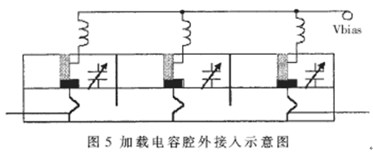 傳統(tǒng)的小信號電調(diào)螺旋諧振腔、濾波器中,加載電容采用腔內(nèi)安裝接入方式。這種方式易實現(xiàn),但在高頻情況下,腔內(nèi)強(qiáng)行添加異物,使本來就復(fù)雜的螺旋腔場分布變得更為復(fù)雜,導(dǎo)致工作特性難以把握。同時,新物體帶來的分布電容將引起中心頻率的偏移,嚴(yán)重時造成中心頻率超越所需頻段。