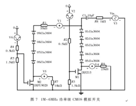 對約束VDD≥Vin≥VSS作深入分析可知,Vin之所以取值有限,根本原因在于其與V柵-襯底的關(guān)聯(lián)。使V柵-襯底獨立,避免Vin、Vout的影響,反過來將讓Vin輕松擺脫束縛。為此,本節(jié)設(shè)計了接地形CMOS傳輸門。原理電路如圖6(b)所示,具體的1M~6MHz高頻、功率級模擬開關(guān)電路見圖7。