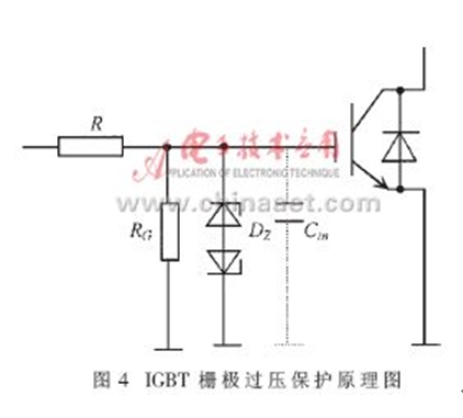 IGBT的驅(qū)動(dòng)設(shè)計(jì)問題亦即MOSFET的驅(qū)動(dòng)設(shè)計(jì)問題;設(shè)計(jì)時(shí)應(yīng)注意以下幾點(diǎn):①IGBT柵極耐壓一般在±20V左右,因此驅(qū)動(dòng)電路輸出端要給柵極加電壓保護(hù),通常的做法是在柵極并聯(lián)穩(wěn)壓二極管或者電阻。前者的缺陷是將增加等效輸入電容Cin,從而影響開關(guān)速度,后者的缺陷是將減小輸入阻抗,增大驅(qū)動(dòng)電流,使用時(shí)應(yīng)根據(jù)需要取舍。圖4為IGBT柵極保護(hù)原理圖,其中,RG、DZ、Cin分別為等效柵極阻抗、穩(wěn)壓管和等效輸入電容。②盡管IGBT所需驅(qū)動(dòng)功率很小,但由于MOSFET存在輸入電容Cin,開關(guān)過程中需要對電容充放電,因此驅(qū)動(dòng)電路的輸出電流應(yīng)足夠大,這一點(diǎn)設(shè)計(jì)者往往忽略。假定開通驅(qū)動(dòng)時(shí),在上升時(shí)間tr內(nèi)線性地對MOSFET輸入電容Cin充電,則驅(qū)動(dòng)電流為