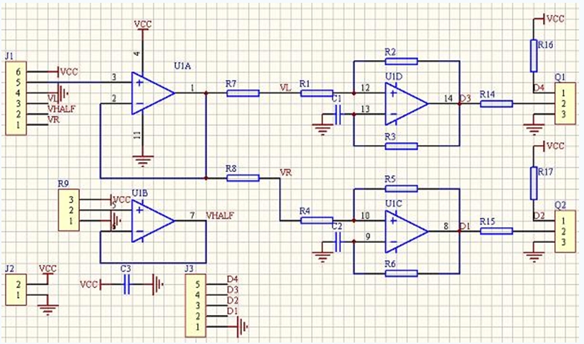 上圖為一個使用游戲手柄或者航模搖桿上的線性電位器(或線性霍爾元件)控制兩個底盤驅動電機的PWM生成電路。J1是手柄的插座,123和456分別是x,y兩個方向的電位器。U1B提供半電源電壓,U1A是電壓跟隨。x,y分量經過合成成為控制左右輪兩個電機轉速的電壓信號。在使用中,讓L=(x+1)y/(x+1。4),R=(x-1)y/(x-0。6),經過試驗有不錯的效果(數字只是單位,不是電壓值)。經過U1C和U1D組成的施密特振蕩器把電壓轉換為相應的PWM信號,用來控制功率驅動電路。以U1D為例,R1,R2組成有回差的施密特電路,上下門限受輸入電壓影響,C1和R3組成延時回路,如此形成振蕩的脈寬受輸入電壓控制。Q1,Q2是三極管,組成反相器,提供差分的控制信號。具體振蕩過程參見對555振蕩器的分析。