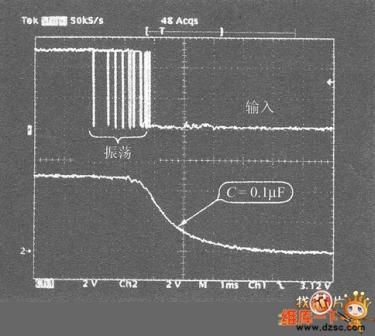圖1是稱為限位開關(guān)的微型開關(guān)的振蕩波形圖。機(jī)械觸點(diǎn)的開關(guān)由于按壓方法、時(shí)間不同會(huì)發(fā)生各種各樣的振蕩,此時(shí)的時(shí)間、波形也各種各樣,這里表示了最長(zhǎng)時(shí)間的振蕩的例子。