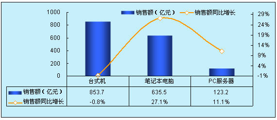 等行業(yè)對IT集中采購出現(xiàn)延后,部分中小企業(yè)資金也出現(xiàn)問題,采購有所停滯,不過,相比較其他IT硬件產(chǎn)品而言,筆記本電腦受影響程度相對較小,增速繼續(xù)領(lǐng)跑。據(jù)賽迪顧問統(tǒng)計,2008年,中國筆記本市場銷售量為901.8萬臺,同比增長43.2%,銷售額達到635.5億元,同比增長為27.1%。