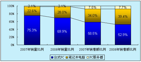 2009年中國IT市場年會上賽迪顧問發(fā)布的最新研究成果顯示,2008年,包括臺式PC、筆記本電腦和PC服務(wù)器在內(nèi)的PCs市場銷量達到3218.5萬臺,同比增長15.2%,銷售額為1612.4億元,同比增長9.6%,增速相比上一年都有較大的下滑。其中,臺式PC與預(yù)期相比下降最大。