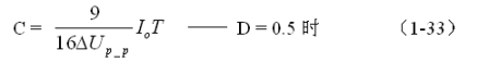 (1-33)和(1-34)式,就是計算反轉式串聯開關電源儲能濾波電容的公式(D = 0.5時)。式中:Io是流過負載電流的平均值,T為開關工作周期,ΔUP-P為濾波輸出電壓的波紋,或電壓紋波。一般波紋電壓都是取電壓增量的峰-峰值,因此,當D = 0.5時,波紋電壓等于電容器充電的電壓增量,即:ΔUP-P = 2ΔUc 。